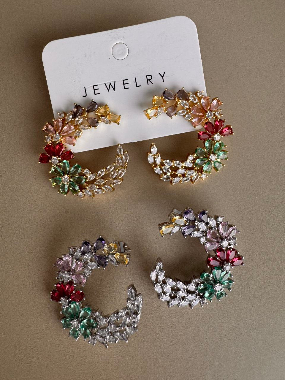 White and pink stone teddy bear earrings in the shape of a heart in gold rhodium plating.