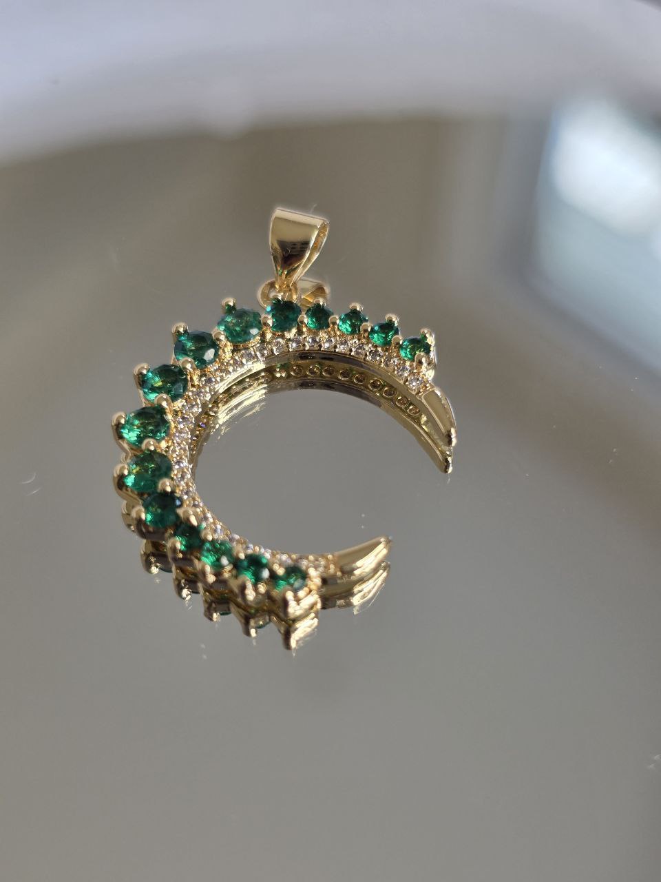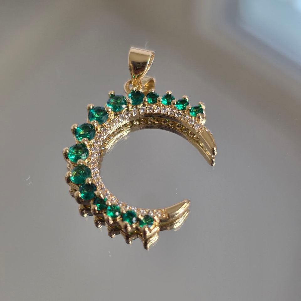 Dije Luna en rodio dorado con piedras verde militar, el perfecto acompañante de tus cadenas.