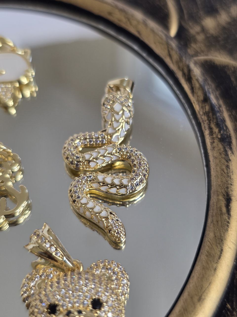 Dije serpiente en rodio dorado con piedras blancas, el perfecto acompañante de tus cadenas.