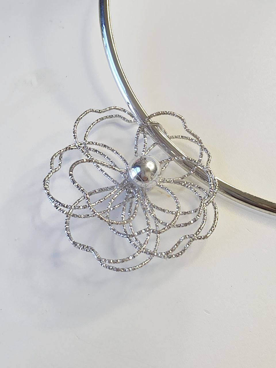 Set gargantilla con arete y dije de flor de alambrismo, en baño en Rodio Plateado un accesorio totalmente en tendencia que te acompañará por siempre.